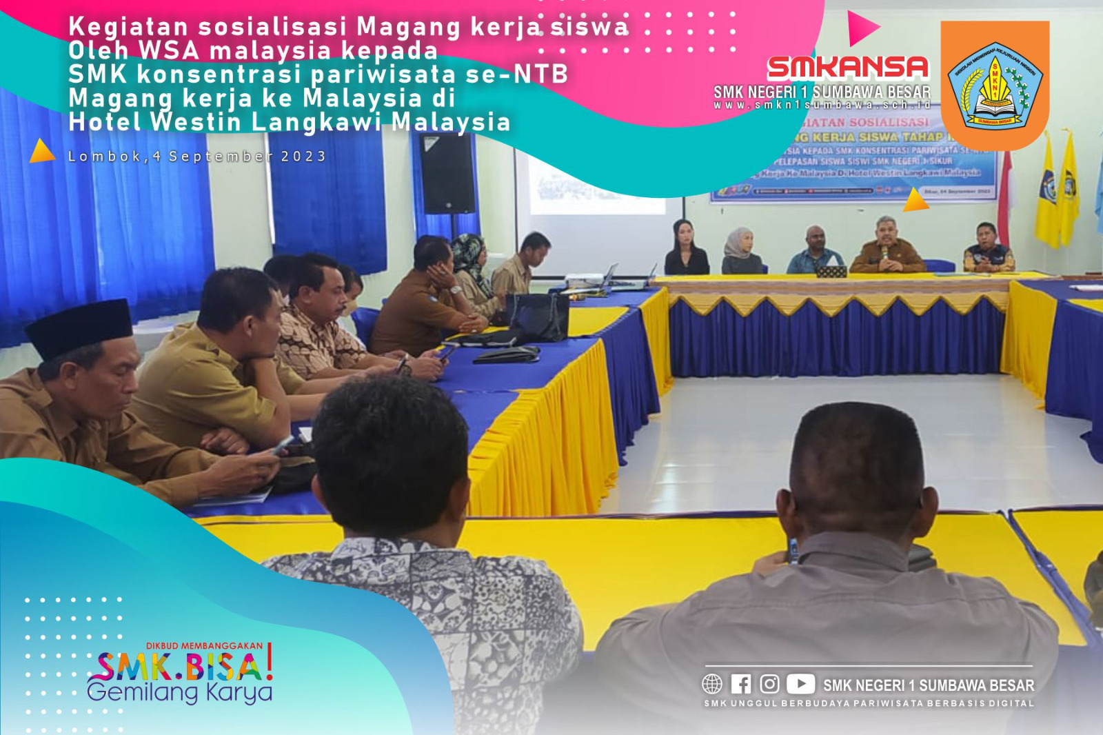 [Berita SMKANSA] Senin, 4 September 2023 – Sosialisasi Magang Kerja Siswa oleh WSA Malaysia ke SMK Konsentrasi Pariwisata Se-Provinsi Nusa Tenggara Barat di SMK Negeri 1 Sikur, Lombok Timur. SMKANSA, SMK Unggul, Berbudaya Pariwisata Berbasis Digital Ikuti media sosial SMKANSA: Facebook: HubinMas Smkn I Sumbawa Instagram: https://www.instagram.com/smkn1sumbawabesar/ https://www.instagram.com/hubinmas_smkn1sumbawa/ Website: https://smkn1sumbawa.sch.id YouTube: https://www.youtube.com/@smknegeri1sumbawabesar63