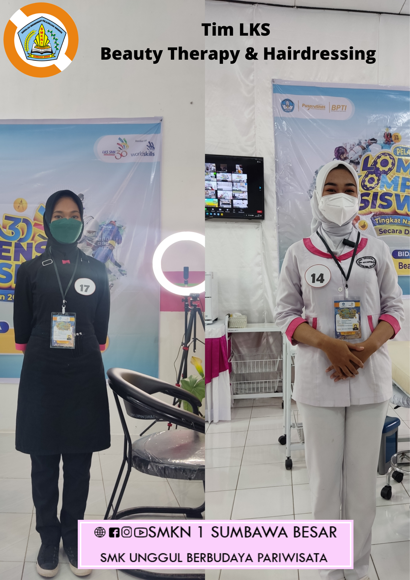 Senin, 24 Oktober 2022 Dua siswi Tata Kecantikan SMKN 1 Sumbawa Besar mengikuti LKS Nasional 2022 selama 4 Hari yang berlangsung secara daring Bidang Beauty Therapy Iva Silvia Wulandari Bidang Hairdressing Erliny Rosalina