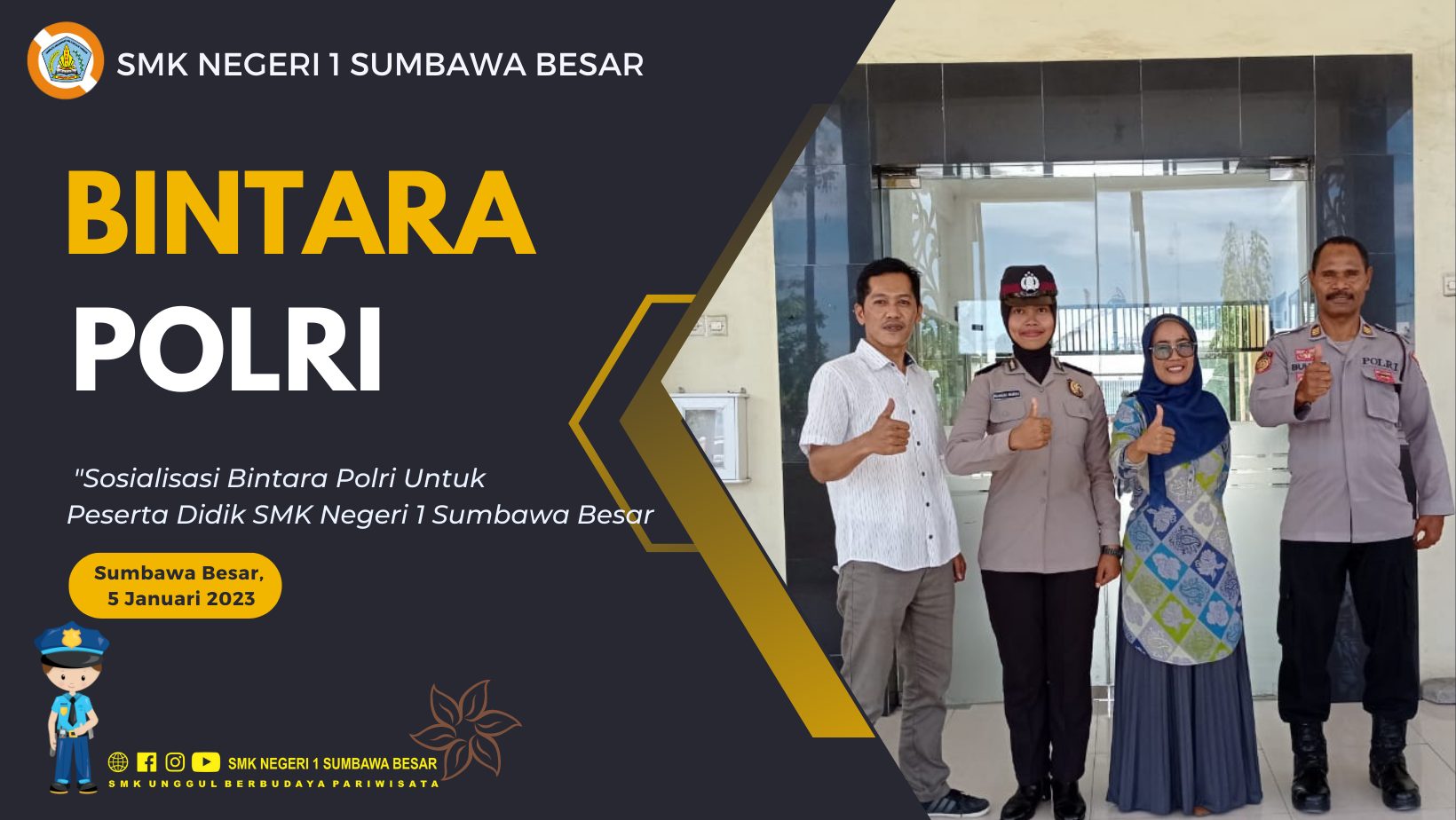 Sumbawa Besar, 05 Januari 2023 Hallo #SobatSMKANSA Kegiatan Sosialisasi Bintara Polri Untuk Peserta Didik SMK Negeri 1 Sumbawa Besar Didampingi oleh Waka. HubinMas (Bapak Ademula, S.Kom.) dan Waka. Kesiswaan (Ibu Indriana Dinartiwi, S.ST.Par). Selamat dan Sukses atas kelulusan menjadi Bintara Polri Atas Nama Rauhun Nabisa Jurusan Teknik Komputer dan Jaringan Alumni SMK Negeri 1 Sumbawa Besar Tahun 2022. Sa-Ya Hebat dan Luar Biasa Tonggak pertama telah tercapai. Saatnya untuk melebarkan sayapmu dan terbang tinggi di langit. Kenalkan ni Uun Rauhun Nabisa Alumni #SMKANSA Tahun 2022 Jurusan Teknik Komputer dan Jaringan. Yukss kk Alumni #SMKANSA Informasikan Diri kalian Pada Tracer Study #SMKANSA Alumni Tahun 2022 melalui Kontak : 📱+6285205468209/📱+6281239003594. Atau yang ingin tanyakan Lowongan Kerja Silahkan Kontak kami ya Kk Alumni #SMKANSA. Succes dan Sehat Selalu Yaa kk Alumni #SMKANSA😍 Sa-Ya Bisa Hebat dan Luar Biasa