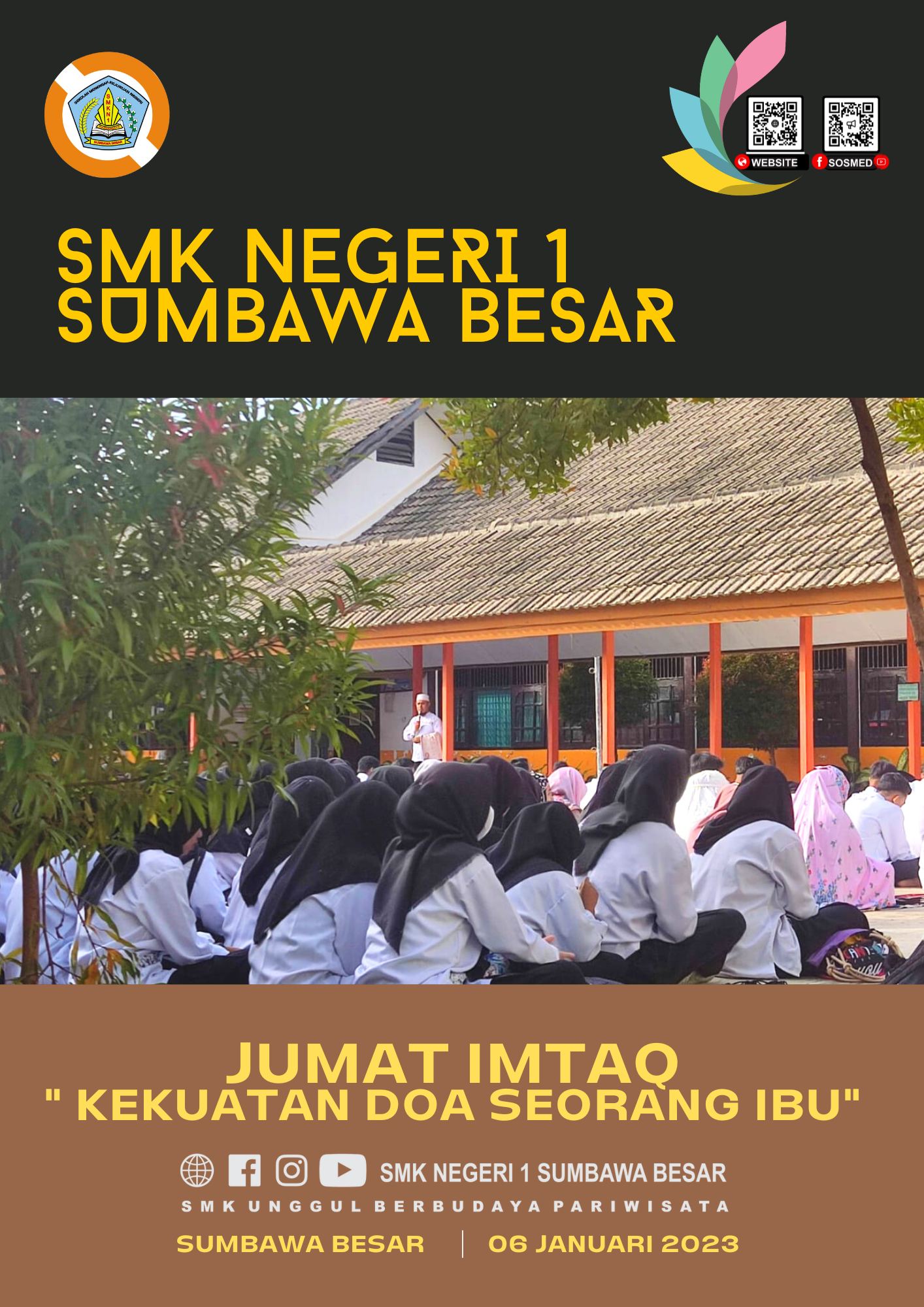Sumbawa Besar, 06 Januari 2023 Hallo #SobatSMKANSA, Pagi ini Jumat Imtaq bersama seluruh warga SMK Negeri 1 Sumbawa Besar yang diselenggarakan di tiga tempat. Peserta Didik Agama Islam menghadiri Imtaq di Halaman Tengah sedangkan Peserta Didik beragama lain di Ruang Kelas dan Bistro. Pelaksanaan Imtaq diawali dengan Pembacaan Surat Yasin secara bersama-sama kemudian dilanjutkan dengan tausiah dengan tema “Kekuatan Doa Seorang Ibu”. Ada tiga doa yang tidak akan tertolak bahkan doanya menembus langit ialah Doa seorang IBU, Doa yang sedang berpuasa, Doa orang yang musyafir disampaikan oleh Guru Agama dan peserta didik secara bergantian tiap minggunya. Semoga tausiah pada pagi ini bermanfaat untuk kita semua. Sa-Ya Bisa Hebat dan Luar Biasa #JumatImtaqSMKANSA