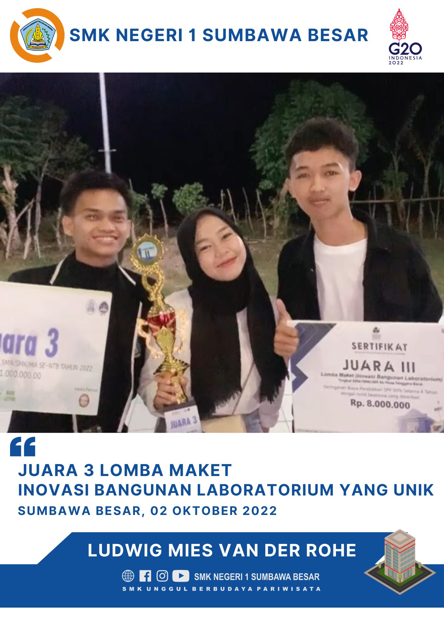 Sumbawa Besar, 02 Oktober 2022 Hallo #SobatSMKANSA, Congratulation teruntuk Tim Ludwig Mies Van Der Rohe Ketua Tim : Putra Astaman Anggota : Ardiatun Wasiah dan Muhammad Afaki Kelas Kompetensi Keahlian Teknik Komputer dan Jaringan (TKJ) Telah Meraih Juara 3 Lomba Maket Inovasi Bangunan Laboratorium Yang Unik (UTS). Jangan berhenti menuntut ilmu. Berinovasilah Selalu Dalam Berkarya. Sa-Ya Bisa Hebat dan Luar Biasa #SMKANSA #LombaMaket