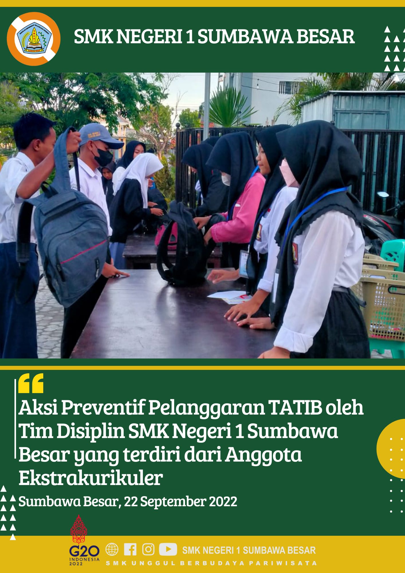 Hallo #sobatSMKANSA, Aksi Preventif Pelanggaran TATIB oleh Tim Disiplin SMK Negeri 1 Sumbawa Besar yang terdiri dari Anggota Ekstrakurikuler. Sumbawa Besar, 22 September 2022 Sa-Ya Bisa Hebat dan Luar Biasa #TatibSMKANSA #EkstrakurikulerSMKANSA