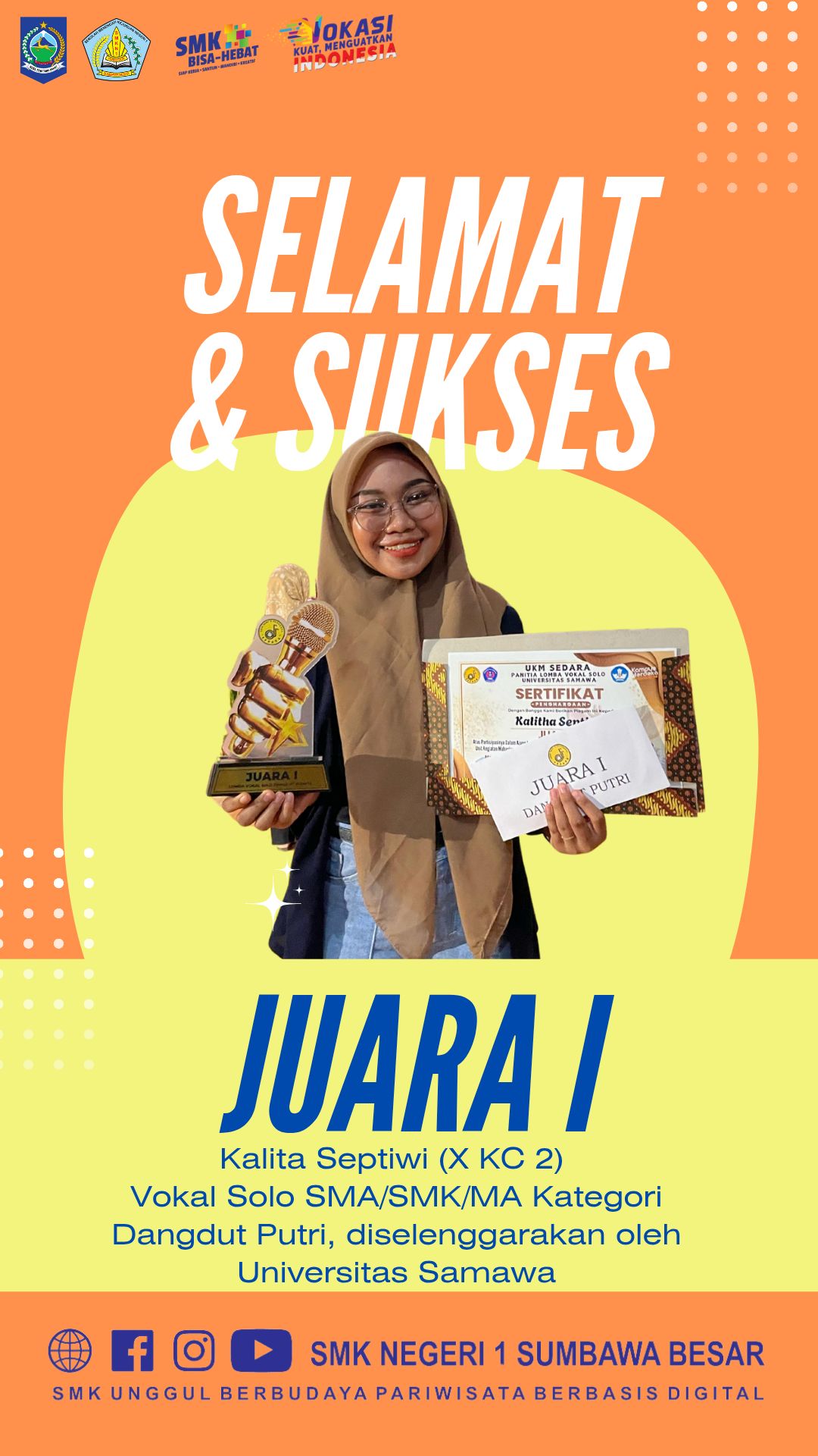 Sabtu, 22 Februari 2025 Kalita Septiwi (X KC 2) Juara 1 Vokal Solo SMA/SMK/MA Kategori Dangdut Putri, diselenggarakan oleh Universitas Samawa. #smkansa #smkn1sumbawabesar #dikbudntb