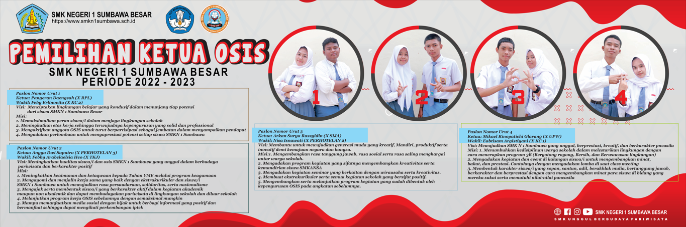 PASLON NOMOR 1 VISI : Menciptakan lingkungan belajar yang kondusif dalam menunjang tiap potensi dari siswa SMKN 1 Sumbawa Besar MISI : Memaksimalkan peran siswa/i dalam menjaga lingkungan sekolah Meningkatkan etos kerja sehingga terwujudnya kepengurusan yang solid dan profesional Mengaktifkan anggota OSIS untuk turut berpartisipasi sebagai jembatan dalam menyampaikan pendapat Menggadakan perlombaan untuk mengapresiasi potensi setiap siswa SMKN 1 Sumbawa Besar PASLON NOMOR 2 VISI : Meningkatkan kualitas siswa/i dan OSIS SMKN 1 Sumbawa yang unggul dalam berbudaya pariwisata dan berkarakter positif MISI : Meningkatkan keimanan dan ketaqwaaan kepada tuhan YME melalui program keagamaan Mengayomi dan menjalin kerja sama yang baik dengan ekstrakulikuler dan siswa/i SMKN 1 Sumbawa untuk mewujudkan rasa persaudaraan, solidaritas, serta nasionalisme Mengajak serta membentuk siswa/i yang berkarakter aktif dalam kegiatan akademik maupun non akademik dan dapat membudayakan pariwisata di lingkungan sekolah dan diluar sekolah Melanjutkan program kerja OSIS sebelumnya dengan semaksimal mungkin Mampu memanfaatkan media sosial dengan bijak untuk berbagi informasi yang positif dan bermanfaat sehingga dapat mengikuti perkembangan iptek PASLON NOMOR 3 VISI : Membantu untuk mewujudkan generasi muda yang kreatif, mandiri, produktif, serta inovatif demi kemajuan negara dan bangsa. MISI : Mengembangkan rasa tanggung jawab, sosial serta saling menghargai antar warga sekolah. Mengadakan program kegiatan yang sifatnya mengembangkan kreativitas serta kemandirian siswa SMKANSA. Mengadakan kegiatan seminar yang berkaitan dengan wirausaha serta kreativitas. Membuat ekstrakulikuler serta semua kegiatan sekolah yang bersifat positif. Mengembangkan serta melanjutkan program kegiatan yang sudah dibentuk oleh kepengurusan OSIS pada angkatan sebelumnya. PASLON NOMOR 4 VISI : Mewujudkan SMKN 1 Sumbawa yang unggul, berprestasi kreatif dan berkarakter pancasila MISI : Menumbuhkan kedisiplinan warga sekolah dalam melestraikan sekolah dengan cara menerapkan program 3B ( Bergotong royong, Bersin, dan Berwawasan lingkungan ) Mengadakan kegiatan dan event dikalangan siswa/i untuk mengembangkan minat, bakat dan prestasi. Contohnya dengan mengadakan lomba disaat class meeting Membentuk karakter siswa/i yang sopan,santun, adil, berakhlak mulia, bertanggung jawab, berkarakter, dan berprestasi dengan cara mengembangkan minat para siswa di bidang yang mereka sukai serta mematuhi nilai – nilai pancasila